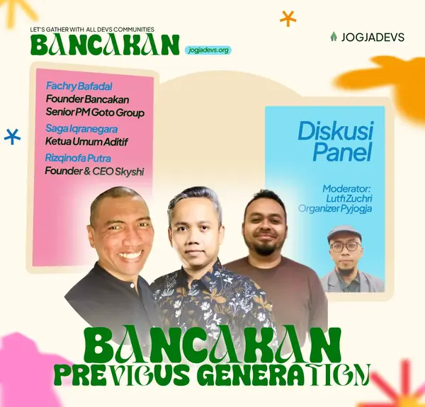 Gabung di Bancakan JogjaDevs 2025, event kolaboratif terbesar di Yogyakarta yang menyatukan lebih dari 10 komunitas teknologi. Nikmati 12‑16 sesi dengan pembicara dari tiap komunitas, serta panel diskusi, lightning talk, dan networking dalam suasana sederhana namun hangat khas Jogja.